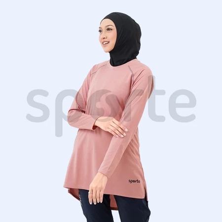 Baju kaos olahraga (sportwear) untuk perempuan aktif, mendukung aktivitas olahraga (sportwear) dan kegiatan aktif lainnya (active wear – modest sportwear).